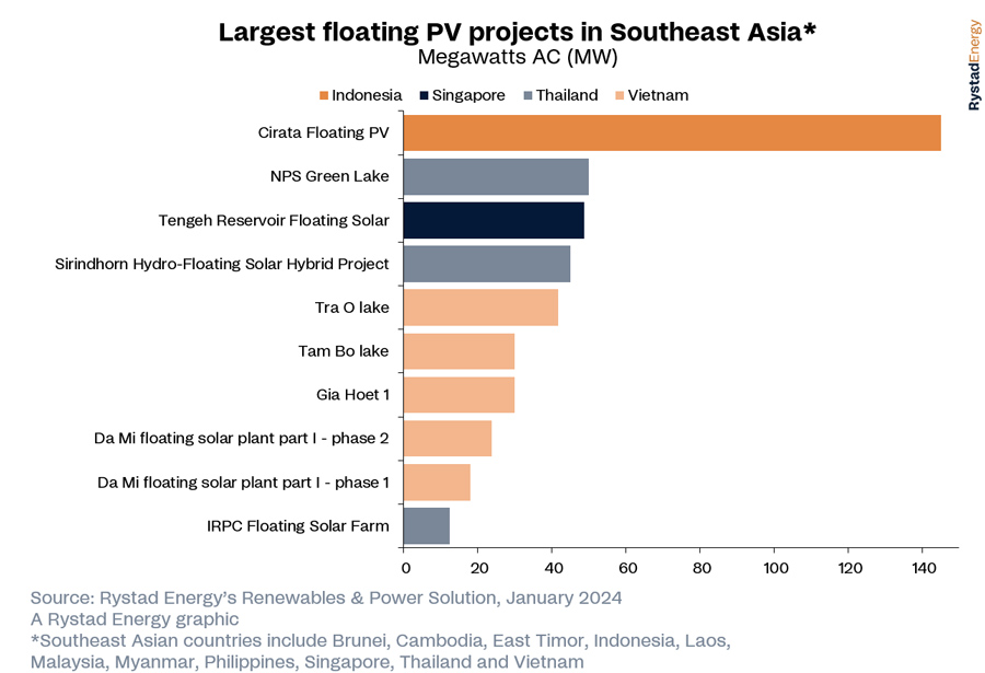 Addressing land rights is a pivotal challenge for solar developers in Southeast Asia due to the predominant use of available land for agricultural purposes. The region grapples with a scarcity of suitable sites for solar farms, intensifying the need for innovative solutions. In particular, FPVs have emerged as a viable option, leveraging bodies of water adjacent to agricultural areas. This approach not only circumvents land access tensions but also presents a potential blueprint for other countries grappling with similar issues. Operational FPV projects in Southeast Asia currently amount to around 500 MW combined. However, according to Rystad Energy’s data, an anticipated 300 MW of FPV capacity is expected to be added across Southeast Asia in early 2024 alone. Currently, nine of the world’s top 10 FPV projects by size are in China, with the only exception being the Cirata FPV project in West Java, Indonesia, which was commissioned in November 2023. The project boasts capacity of 145 megawatts-alternating-current (MWac), setting an example that will be followed as more FPV projects enter the fold. Owned by the state utility Perusahaan Listrik Negara (PLN) and the Emirati renewable energy company, Masdar, the Cirata FPV project is the largest of its kind in Southeast Asia, surpassing others in mainland China and Taiwan (China). FPVs have emerged as a game-changer for Southeast Asia, catalyzing the region’s push towards clean energy by maximizing its abundant solar resources and overcoming limited land availability. Their modular design allows for integration with existing hydropower dams and unlocks tremendous opportunities for hydropower-rich nations like Laos, Thailand and Indonesia. Additionally, with land rights a major deterrent facing solar developers in Southeast Asia, as much of the land is used for agriculture, FPVs provide a solution for the coexistence of solar farms and agriculture. Jun Yee Chew, Head of Asia renewables and power research, Rystad Energy