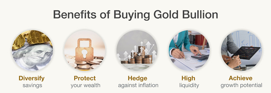 • There are several benefits of buying gold bullion, including diversifying retirement savings, hedging against inflation, and protecting wealth.