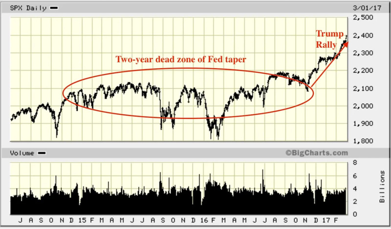 We saw the bull’s back break in a shocked response to Fed tapering that reverberated throughout 2015-2016, taking two big plunges and finally closing that period where it began. So, the market didn’t completely crash, but the bull lay half-dead on the ground for two full years! That’s big in itself. The Fed began tapering QE and then just slightly raising interest rates during that time—slightly—and the market got bounced around like a bull tied to the back of a freight train, but went nowhere: