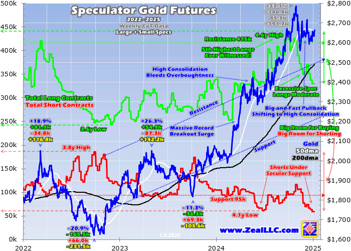 Because of those extreme risks inherent in hyper-leveraged gold-futures trading, only a small fraction of traders are willing to attempt it.  And they really don’t control much capital in the grand scheme of the markets, although its gold-price impact is greatly magnified.  So over time spec longs and shorts tend to form largely-horizontal trading ranges.  As spec longs greatly outnumber shorts, they are more important.