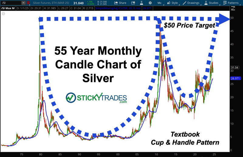 History does not repeat itself exactly, but in the world of technical analysis, patterns most definitely repeat. In fact, one of the most reliable price patterns is the textbook Cup & Handle formation. Below you will see a 55-year monthly chart of silver, highlighting the pattern I am referring to.