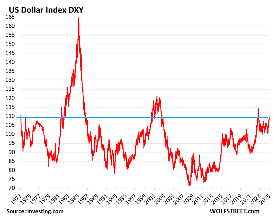 The USD has risen sharply against a basket of other currencies in recent months, as tracked by the Dollar Index [DXY], but remains below the 2022 high, well below the 2001 high, and hugely below the 1985 high. So we see these huge peaks and valleys, but now the dollar is about where it had been in 1977.