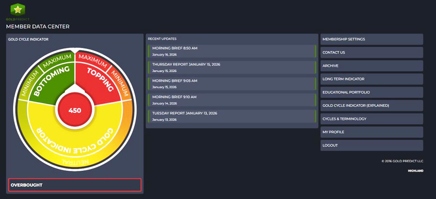 Our Gold Cycle Indicator is maxed out at 450, signaling an approaching market top.