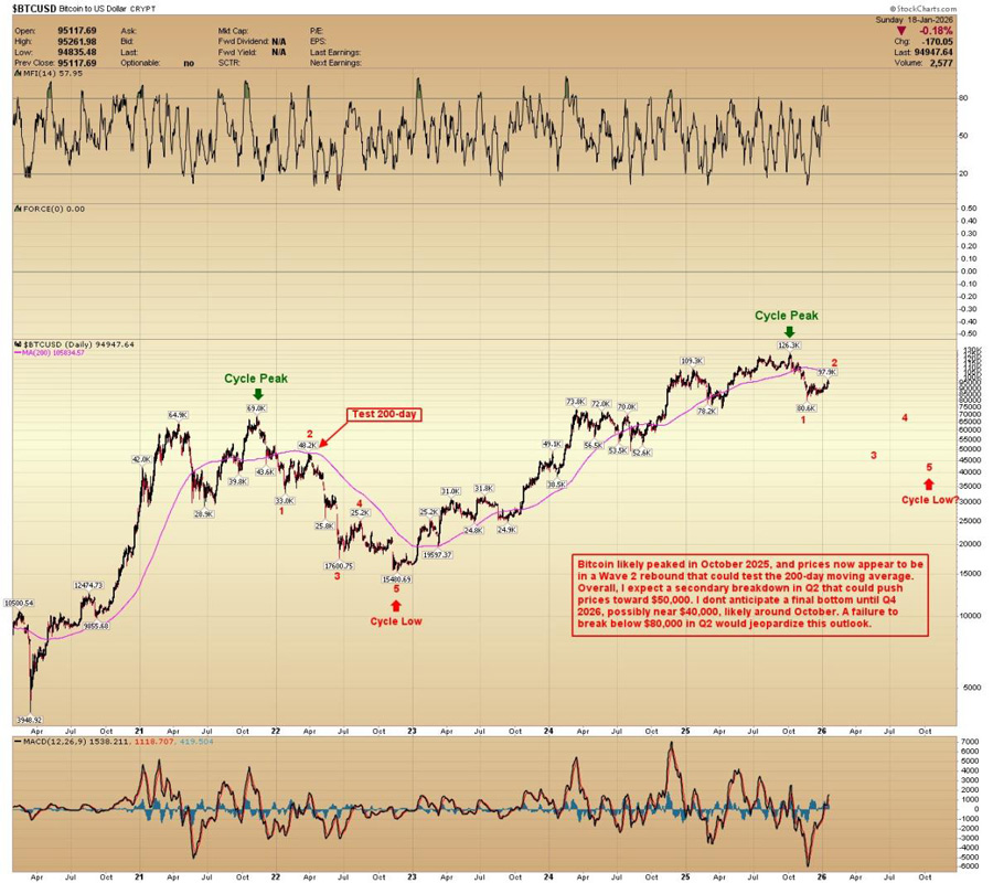 BITCOIN: Bitcoin likely peaked in October 2025, and prices now appear to be in a Wave 2 rebound that could test the 200-day moving average. Overall, I expect a secondary breakdown in Q2 that could push prices toward $50,000. I don’t anticipate a final bottom until Q4 2026, possibly near $40,000, likely around October. A failure to break below $80,000 in Q2 would jeopardize this outlook.
