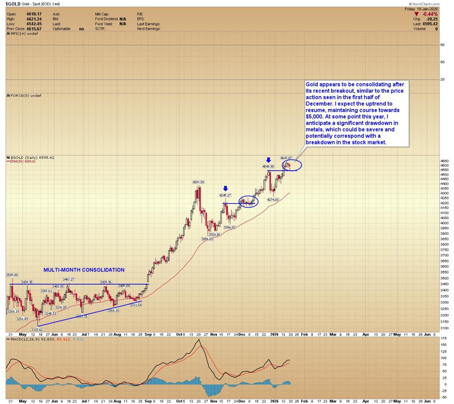 GOLD: Gold appears to be consolidating after its recent breakout, similar to the price action seen in the first half of December. I expect the uptrend to resume, maintaining course towards $5,000. At some point this year, I anticipate a significant drawdown in metals, which could be severe and potentially correspond with a breakdown in the stock market.