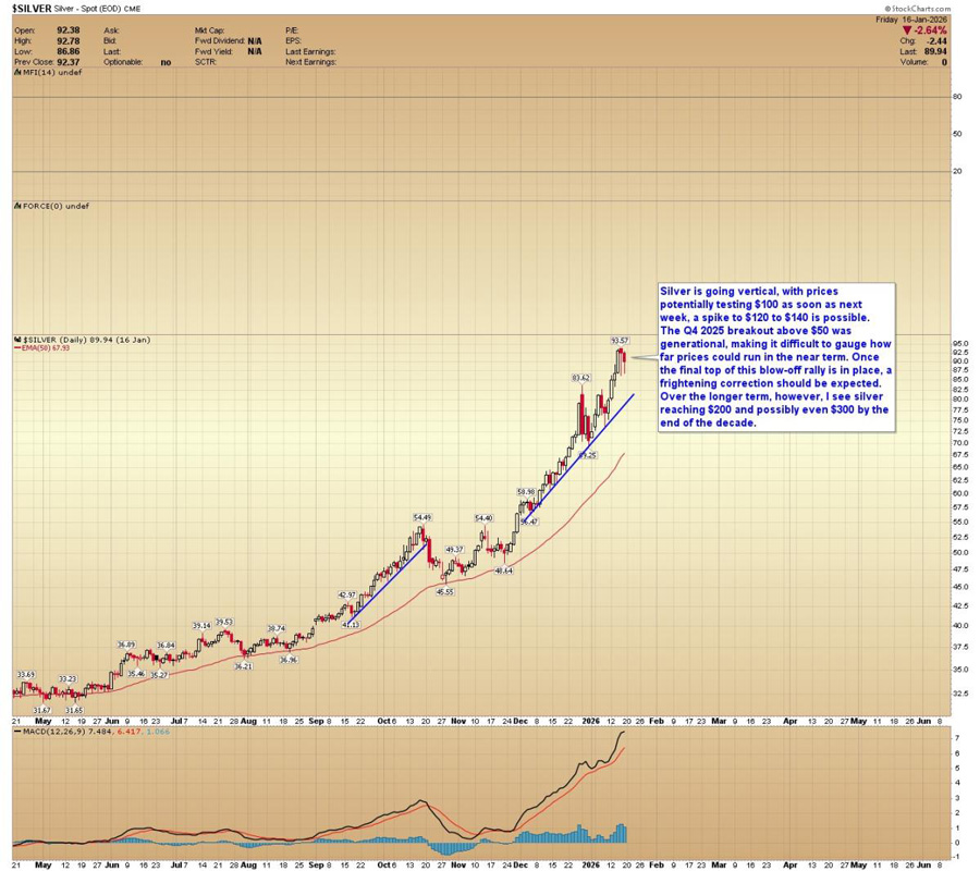 SILVER: Silver is going vertical, with prices potentially testing $100 as soon as next week; a spike to $120 to $140 is possible. The Q4 2025 breakout above $50 was generational, making it difficult to gauge how far prices could run in the near term. Once the final top of this blow-off rally is in place, a frightening correction should be expected. Over the longer term, however, I see silver reaching $200 and possibly even $300 by the end of the decade.
