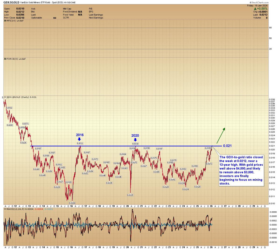 GDX-to-GOLD RATIO: The GDX-to-gold ratio closed the week at 0.0212, near a 13-year high. With gold prices well above $4,000—and likely to remain above $3,000—investors are finally beginning to focus on mining stocks.