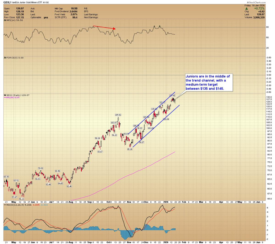 GDXJ: Juniors are in the middle of the trend channel, with a medium-term target between $135 and $145.