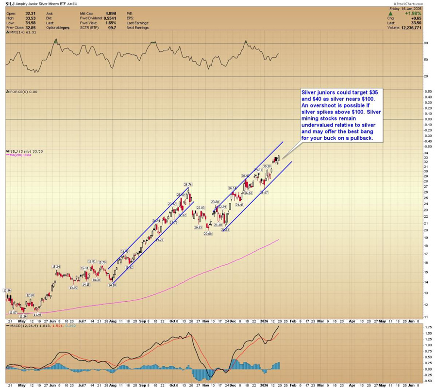 SILJ: Silver juniors could target $35 and $40 as silver nears $100. An overshoot is possible if silver spikes above $100. Silver mining stocks remain undervalued relative to silver and may offer the best bang for your buck on a pullback.