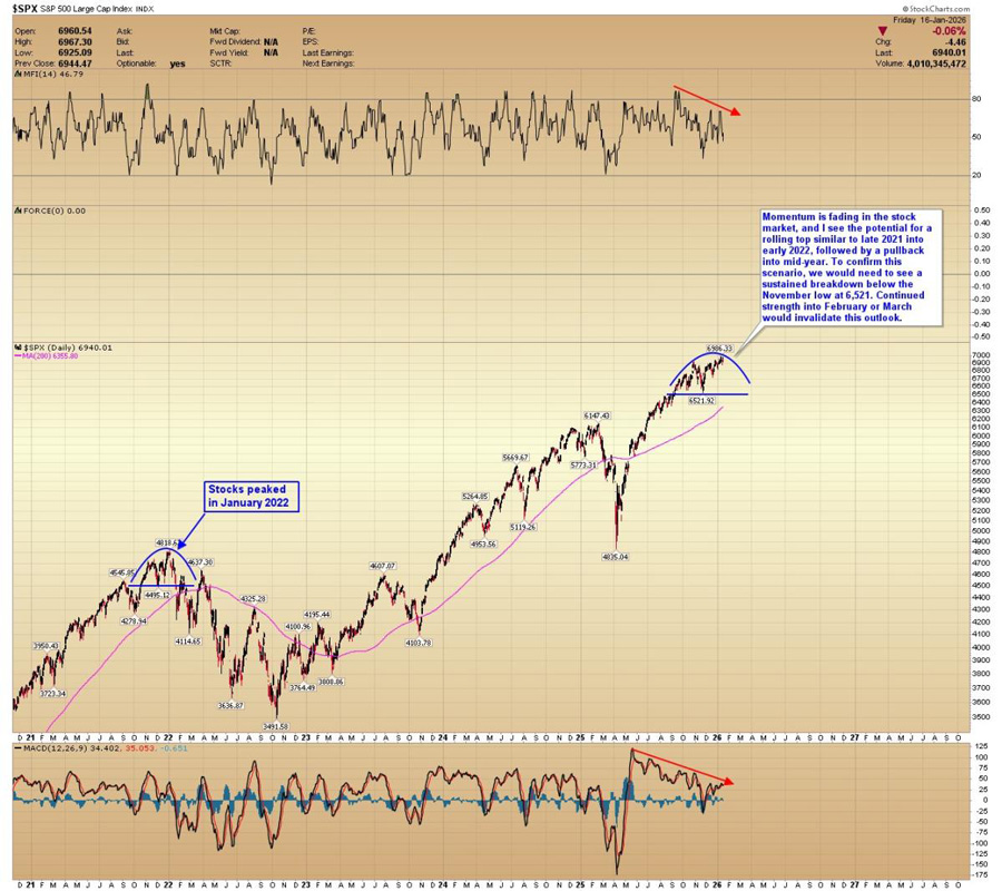 S&P 500: Momentum is fading in the stock market, and I see the potential for a rolling top similar to late 2021 into early 2022, followed by a pullback into mid-year. To confirm this scenario, we would need to see a sustained breakdown below the November low at 6,521. Continued strength into February or March would invalidate this outlook.