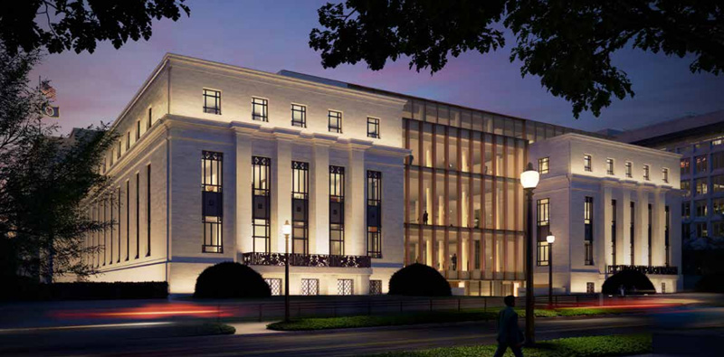 • An atrium VIP entrance, pictured below, with skylights in a “very calm, almost ethereal square grid with large format glass,” with “twelve equal spaces in salute of the Federal Reserve’s branch banks. Each branch bank will be recognized with their name engraved in glass panels” (p. 34).