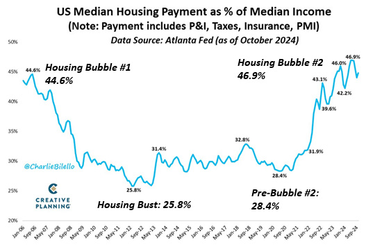 3. Those who locked in low mortgage rates are trapped in their current homes, as they can't afford to move and pay interest rates that are 50% to 100% higher than the low rates they secured years ago. The Federal Reserve intervened massively in the private mortgage market in the post 2008 era, effectively socializing the mortgage market as the means to push mortgage rates down to encourage "growth." The Fed's intervention helped inflate Housing Bubble #2, just as the subprime excesses of the early 2000s helped inflate Housing Bubble #1. These distortions were intended to fuel home buying, but they also fueled massive increases in housing valuations. 4. The total costs of ownership--the monthly nut including mortgage and other costs--now exceeds the peak in Housing Bubble #1. Buying a house now is not a guaranteed pathway to financial security, it's a wager that valuations will continue to soar ever higher, generating capital gains that will offset the decades of higher costs of ownership.