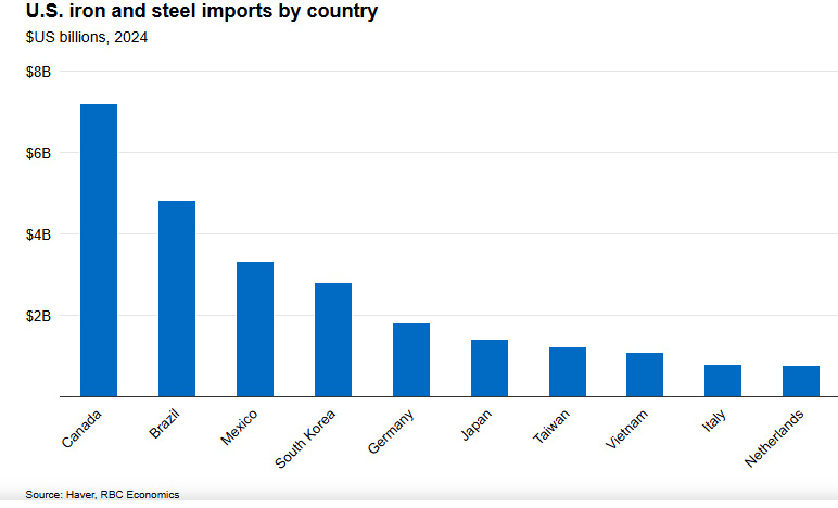 After months of threatening tariffs on U.S. trading partners during his 2024 presidential campaign, Trump has now taken definitive action on that front. Let’s review. The BeginningOn Saturday, February 1, Trump announced that the U.S. was imposing 25% tariffs on all goods imported to the U.S. from Mexico and Canada (with the exception of Canadian energy, which was tariffed at 10%) and additional 10% tariffs on all goods imported from China. These new Chinese tariffs were on top of tariffs Trump imposed on China in 2018, many of which were left in place during the Biden administration. All of these new tariffs were to take effect on Monday, February 3rd. Boom! Or was it? The Mexican ConcessionOn February 3rd, within hours of the scheduled deadline for the new tariffs, Trump reached an accommodation with Mexico. President Claudia Sheinbaum agreed to surge 10,000 Mexican troops to the U.S./Mexican border both to prevent illegal immigration into the U.S. and to curtail the flow of fentanyl across the border. (Trump had already surged 5,000 U.S. troops to the border for the same purpose. Reportedly illegal border crossings have already declined 96% compared to the Biden administration). In return, Trump agreed to postpone application of the Mexican tariffs for 30 days while the two sides discussed other actions and accommodations. The new deadline for tariffs is March 3, 2025. Canada Follows SuitTrump also spoke with Canadian Prime Minister Justin Trudeau on February 3rd. Trudeau did not initially make any concessions but late in the day on February 3rd he made the same offer as Mexico – 10,000 troops on the border and additional efforts to stop the flow of illegals and fentanyl. Trump accepted the offer and extended imposition of tariffs on Canada by 30 days. But Trump Raises the StakesThese delays did not mark the end of the tariff confrontation. Beijing announced they were imposing retaliation tariffs on U.S. goods, including a 15% border tax on imports of U.S. coal and liquefied natural gas products. There is also a 10% tariff on American crude oil, agricultural machinery and large-engine cars. Trump answered by imposing a 25% tariff on all steel and aluminum imports into the United States. This will have a major impact on Canadian steel imports as shown in the chart below.