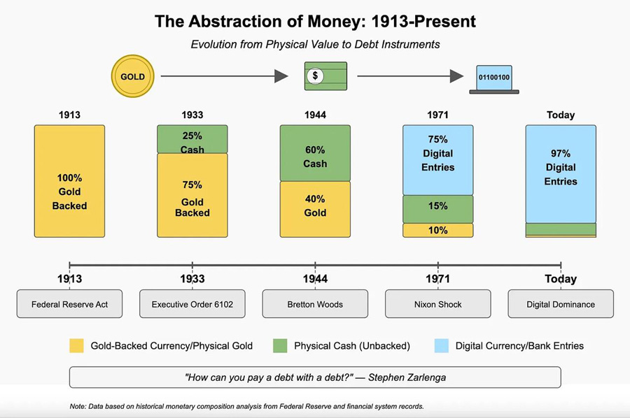 While the chart shows increasing digitization, the fundamental issue isn't the digital format itself. The concept behind technologies like Bitcoin – creating digital assets with properties that could potentially resist centralization – illustrates that digitization alone isn't the problem. The core concern is money becoming mere accounting entries in a centralized ledger that can be adjusted without the constraints that physical gold once imposed.