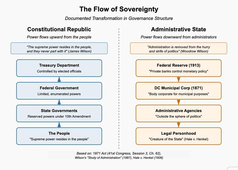 This evidence prompts a fundamental reexamination of modern sovereignty, citizenship, and consent in ways that transcend traditional political divisions. For the average American, these historical transformations have concrete implications. The administrative systems created between 1871-1933 structure daily life through financial obligations, identification requirements, and regulatory compliance that operate largely independent of electoral changes. Understanding this history illuminates why citizens often feel disconnected from governance despite formal democratic processes - the systems managing key aspects of modern life (monetary policy, administrative regulation, citizen identification) were designed to operate with substantial independence from direct citizen control. While mainstream interpretations of these developments emphasize practical governance needs and economic stability, the documented patterns suggest the possibility of more fundamental changes in America's constitutional structure deserving closer scrutiny. I stumbled across a peculiar reference to the 1871 Act while browsing on Twitter. The post suggested that the United States had undergone a secret legal transformation in 1871, converting it from a constitutional republic into a corporate entity where citizens were treated more like assets than sovereigns. What caught my attention wasn't the claim itself, but how confidently it was stated - as if this fundamental transformation of America was common knowledge. My first instinct was to dismiss it as yet another internet conspiracy theory. A quick Google search led to a PolitiFact ‘fact-check’ dismissing the entire concept as 'Pants on Fire' false. What's striking isn't just the brevity with which they dismiss a complex historical question, but their methodology. They interviewed exactly one legal expert, cited no primary documents from the Congressional Record, examined none of the subsequent Supreme Court cases that reference federal corporate capacity, and ignored the documented financial transformation that followed. I've noticed that when establishment fact-checkers reject claims with such dismissive certainty while conducting minimal investigation, it often signals something worth examining more carefully. This pattern prompted me to check the actual Congressional Record myself. That first document pulled a thread that unraveled into this investigation. Like finding an unexpected door in a familiar house, I couldn't help but wonder what else I'd been walking past without noticing. This analysis unfolds through several interconnected sections: First, we'll examine the historical context of the 1871 Act that reorganized Washington DC using corporate terminology, and explore the emergence of three influential power centers (London, Vatican City, and Washington DC) with documented financial and diplomatic connections. Next, we'll trace the transformation of governance structures between 1913-1933, focusing on Wilson's administrative state and the Federal Reserve's establishment. We'll then analyze the evolution of legal frameworks that redefined citizenship and the monetary system, particularly the dual identity concept distinguishing natural persons from legal entities. Finally, we'll examine modern sovereignty through the Ukraine case study, before offering reflections on reclaiming authentic governance. Throughout, we'll prioritize primary sources and pattern recognition over isolated coincidences, inviting readers to examine the evidence and draw their own conclusions. Behind the National Illusion When I investigated further, I discovered that in 1871, an event did indeed occur in Washington DC that deserves closer examination. The "Act to Provide a Government for the District of Columbia" was passed in the aftermath of the Civil War, at a time when the United States was deeply in debt to international banking interests. While conventionally understood as a simple municipal reorganization, this legislation contains peculiar language and structures that raise profound questions about its broader implications. The Act established a "municipal corporation" for DC with specific language that differs markedly from previous founding documents at a time of significant changes in international finance. E.C. Knuth's meticulously researched work The Empire of The City documents how the passage of this Act occurred during a period when the international financial powers centered in the City of London were actively restructuring their relationships with nation-states. Knuth presents compelling evidence about the changing nature of sovereignty during this period, backed by extensive documentation from the Congressional Record and other primary sources. Our understanding of institutions is often shaped by unseen influences. As Edward Bernays observed, “We are governed, our minds are molded, our tastes formed, our ideas suggested, largely by men we have never heard of.” This compels us to wonder: Might our fundamental understanding of national structure itself be yet another manufactured reality designed for public consumption? When we examine how various aspects of our reality operate by decree rather than by natural law or genuine consent, we might ask whether our conception of national sovereignty itself might be another form of fiat reality. The patterns of governance transformation identified above did not emerge in isolation. This systematic transformation follows what historian Anthony Sutton documented as a pattern of financial-political collusion transcending apparent ideological divisions. In his work Wall Street and the Rise of Hitler, Sutton revealed that Chase Bank, controlled by the Rockefellers, continued to collaborate with Nazi Germany even after Pearl Harbor, handling Nazi accounts through their Paris branch until 1942. This demonstrates how financial power operates independently of national policy or supposed wartime loyalties. Three Centers of Pow