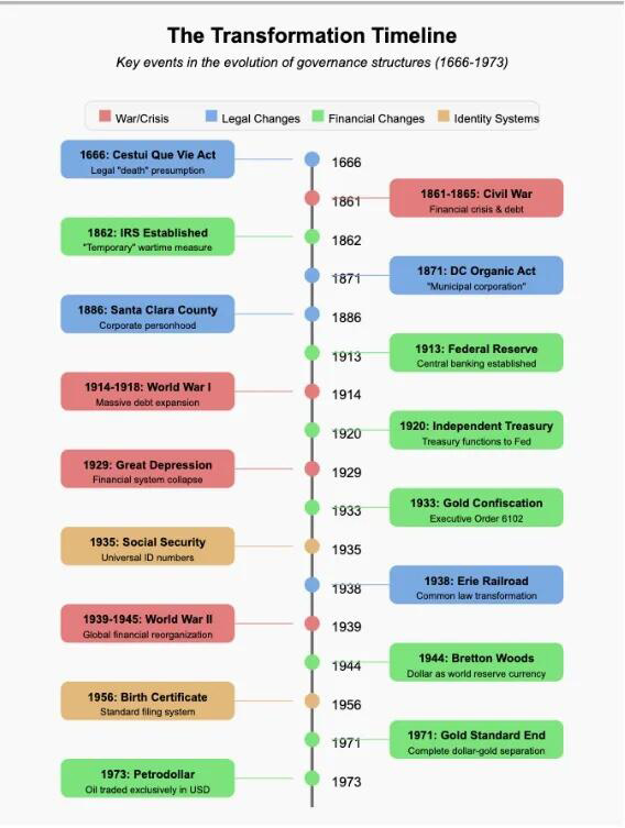 These three power centers did not emerge independently. Their development follows a historical pattern of legal and financial changes beginning with the 1871 Act's corporate restructuring of Washington D.C.. The City of London had already established its unique financial autonomy centuries earlier, while Vatican City would formalize its sovereignty in the 1929 Lateran Treaty. Their evolution accelerated through the early 20th century as banking models and governance structures increasingly aligned, particularly during key financial reforms of the 1913-1944 period documented by financial historians. Understanding this timeline reveals how governance structures transformed incrementally through seemingly unrelated developments that, viewed collectively, point to a coherence rarely acknowledged in mainstream accounts. Historical Context (1871-1913) The 1871 Act and DC ReorganizationThe Act established a "municipal corporation" for DC with specific language that differs markedly from previous founding documents. What's particularly intriguing is the timing – coming after a devastating civil war that had left the country financially vulnerable, and coinciding with significant changes in international finance. The text of the Act, preserved in the Library of Congress (41st Congress, Session 3, Chapter 62), specifically states in Section 2 that it "created a body corporate for municipal purposes" with the power to "contract and be contracted with, sue and be sued, plead and be impleaded, have a seal, and exercise all other powers of a municipal corporation." This corporate designation, while ostensibly for administrative efficiency, uses language typically reserved for commercial entities rather than sovereigns - a fact noted in subsequent Supreme Court cases including Metropolitan Railroad Co. v. District of Columbia (1889), which affirmed DC's status as "a municipal corporation, having a right to sue and be sued." Modern legal scholars remain divided on the broader implications of this Act. Conventional interpretations, such as those expressed by constitutional scholar Akhil Reed Amar, view it as a pragmatic municipal reorganization with limited scope beyond the District itself. However, the timing and language of the Act, coinciding with significant shifts in international finance during a period of national rebuilding, invites deeper examination. Rather than arguing, as some have done, that this Act definitively transformed the entire nation into a corporation, we might more accurately observe that it represented a significant step in a broader pattern of governance changes that accelerated in the decades that followed - particularly in how the relationship between citizens, government, and financial institutions evolved. The distinction between Washington DC as a governmental entity and corporate structures bearing similar names deserves careful examination. In 1925, a corporation called the 'United States Corporation Company' was indeed chartered in Florida (see Articles of Incorporation filed July 15, 1925). However, rather than being the federal government itself, this entity appears to have been a corporate services provider whose stated purpose included acting as 'fiscal or transfer agent' and helping form other corporations. Its authorized capital was a modest $500 with only 100 shares and three initial directors from New York. The company's connection to government remains debated - some researchers note its offices at 65 Cedar Street in New York City coincided with addresses used by Federal Reserve operations, while mainstream historians regard it as simply one of many corporate service providers established during that period of American business expansion. It's important to distinguish between adopting corporate-style management principles and actual corporate conversion. What the evidence suggests is not that the United States literally became a corporation, but rather that governance increasingly adopted corporate-style features: centralized management, administrative hierarchies separated from stakeholders (citizens), and operation through legal frameworks more aligned with commercial than constitutional principles. This distinction matters because it acknowledges the nuance in this historical development. The Congressional debate surrounding the 1871 Act focused primarily on administrative efficiency rather than constitutional transformation. Representative Halbert E. Paine, who reported the bill, described it as addressing 'the inconvenient and cumbersome organization' of the District's government, with discussions centered on practical governance challenges rather than fundamental sovereignty questions. International Banking DevelopmentsBuilding on Knuth's documentation of the City of London's influence mentioned earlier, additional sources provide further context about international financial developments during this period. The Prussia Gate series by Will Zoll provides extensive documentation on how central banking systems evolved across multiple countries, often using nearly identical legislation despite different cultural and economic contexts. Treasury archives confirm that banking families like the Rothschilds maintained correspondence specifically discussing central banking structures with government officials across national boundaries during this period, suggesting coordination that transcended national interests. Zoll's research presents compelling evidence that the City of London Corporation operated with remarkable independence from British law, functioning almost as a sovereign entity within Britain. Financial records confirm its status as a "free-trade zone" since the 11th century, creating a unique structure that attracted banking operations from throughout Europe. The historical evidence suggests patterns worth investigating: economic crises, followed by coordinated media messaging, followed by legislation that centralized financial power. This sequence ap