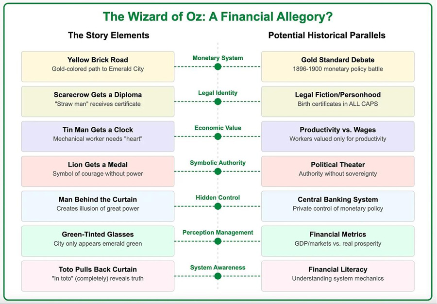 Even more fundamentally, the paradoxical nature of our monetary system - in which debt is meant to be repaid with debt instruments - represents one of the most significant yet least understood transformations in modern economics. The Wizard of Oz: A Financial Allegory? Among the most intriguing, though academically contested, interpretations of American culture is the reading of L. Frank Baum's The Wonderful Wizard of Oz as a potential monetary allegory. Published during the heated debates over the gold standard that dominated the 1896 and 1900 presidential elections, the book contains elements that scholars have identified as potential economic commentary. The Wizard of Oz struck me differently when I revisited it after this research. What I once enjoyed as a simple fairy tale suddenly revealed itself as something potentially more profound - Dorothy and her companions confront the all-powerful Wizard, only to discover that behind the elaborate illusion is a small, insignificant man manipulating levers. It is a perfect metaphor for how we perceive authority: grand, intimidating, and omnipotent - until we dare to look behind the curtain. Consider these potential parallels that some scholars have proposed, though it remains debated whether Baum intended these connections: Dorothy walks the Yellow Brick Road (gold standard) in silver shoes (changed to ruby slippers in the film). This mirrors the major monetary debate of the era - whether to base the dollar solely on gold or to include silver in a bimetallic standard. The character symbolism extends further into legal and financial frameworks. The Scarecrow - the "straw man" without a brain - offers a particularly compelling parallel to the legal concept of personhood. Legal analysts note that when the Scarecrow asks the Wizard for a brain, he receives only a certificate - much like how a birth certificate creates a legal "person" distinct from the living human being. As attorney Mary Elizabeth Croft explains in her analysis of legal personhood, "The strawman represents the legal fiction created at birth - an entity with no consciousness or will of its own, yet one that interfaces with the financial-legal system." This interpretation is strengthened by court decisions like Pembina Consolidated Silver Mining Co. v. Pennsylvania (1888), which established precedent for treating non-human entities as legal "persons" under the 14th Amendment. While many legal experts reject the 'strawman theory' as an oversimplification of complex legal structures, the parallels remain thought-provoking. Traditional jurisprudence views the personhood distinctions in corporate law as pragmatic legal fictions designed to facilitate commerce, not to convert human identity into financial instruments. Courts have uniformly rejected arguments relying on the strawman theory, which Wikipedia notes is recognized in law as a “scam” and the IRS considers it a frivolous argument and fines people who claim it on their tax returns. Courts have rejected these interpretations primarily on procedural grounds (finding no statutory basis) and by noting that capitalization conventions in legal documents serve administrative purposes rather than creating separate legal entities, and that Congress never explicitly authorized converting citizen status into financial instruments. However, the distinction between natural and legal persons in our governance system - regardless of original intent - has created a dual framework where interactions with government increasingly occur through this legally-constructed identity rather than as natural individuals. The Tin Woodman presents one of the most fascinating parallels. Beyond representing industrial workers dehumanized by industrialization, some researchers have noted that "TIN" could be read as an early reference to the concept of identification numbers. More specifically, some interpretations suggest 'TIN' directly references Taxpayer Identification Numbers. His rusted, frozen state after working himself to exhaustion mirrors how the tax system extracts labor value until citizens are financially immobilized. His search for a heart reflects the spiritual emptiness of a system that reduces humans to economic units. When the Wizard gives him a ticking clock instead of a real heart, it symbolizes how artificial measurements (like GDP, tax revenue, or credit scores) replace genuine human well-being in economic policy. The Cowardly Lion has been variously interpreted as William Jennings Bryan (the populist presidential candidate) or as representing authority figures who maintain power through intimidation but crumble when challenged. In the story, the Wizard gives him an "Official Recognition Award" - a meaningless credential that nonetheless satisfies his desire for status. Political historians have drawn parallels between the Lion and political figures who have the constitutional authority to challenge financial powers but lack the courage to do so. Congressional records from the debates over the Federal Reserve Act show numerous representatives expressing concern about the legislation while ultimately yielding to banking interests. The medal the Lion receives represents the hollow honors bestowed upon political figures who maintain the status quo rather than confronting entrenched power. The Wicked Witch of the West with her flying monkey "police" is an interesting parallel to enforcement systems. Historical records show that the period of the book's publication coincided with the expansion of modern police forces and their increasing use to control labor unrest. The field of poppies where Dorothy falls asleep presents another curious coincidence. Historical records document that during this exact period, the British Empire had indeed been the world's largest dealer in opium, particularly in China - a fact established in Parliamentary records and trade documents from the period. The Emerald City requires visitors to wear green-tinted gl