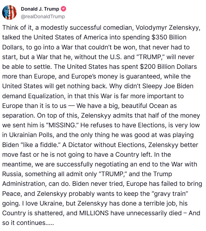 What do you make of this? Doug Casey: It was criminally insane for the US to involve itself in a border war between two countries on the other side of the world. Not many Americans know that “Ukraine,” which was previously always known as “the Ukraine,” means borderland. It was just a region, like Kurdistan, with undefined shifting borders until Lenin created it in 1921. Why, you might ask, would the West take a chance on starting World War III over the most corrupt country in Europe? Several reasons. For one, Ukraine has been a highly effective laundromat. Gigantic amounts of American tax dollars disappeared into a black hole to re-emerge in the pockets of NGOs, masquerading as aid. For another, connected scumbags like the Bidens got fat. Scores of billions were redistributed to weapons manufacturers, military contractors, and God knows who else. And, of course, a large coterie of Neocons in DC have made careers out of trying to destroy Russia at any cost. I only hope that as Trump digs into where all the money has gone, it will result in massive clawbacks and long jail terms for lots of people, both in the US and Europe. International Man: As the post below makes clear, President Trump is displeased with Zelensky. Without US backing, Zelensky’s days in power in Kiev seem to be numbered. What are your thoughts on Zelensky’s future and that of Ukraine?