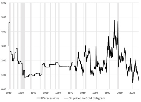 Crude oil priced in grams of gold has reached the second lowest level in history (see exhibit 1). The only time a gram of gold bought more oil was in March 2020, at the height of the COVID19 lockdowns when the world lost a record 30% of oil demand overnight. (As for comparison, at the peak of the 2008-2009 great financial crisis, global oil demand was down just 3%) Exhibit 1: The Oil-to-Gold ratio has dropped to the second lowest level of all time $/gram