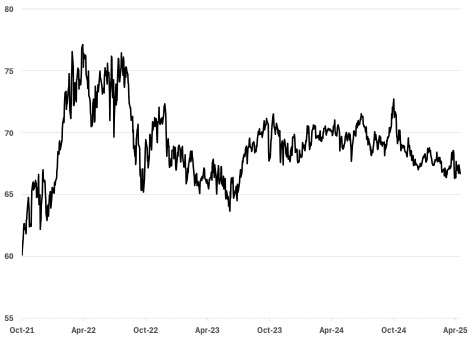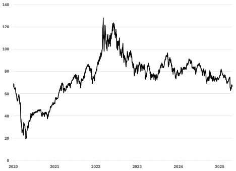 Source: Energy Institute, Goldmoney Research As oil demand has yet to show the impact of the tariffs and an eventual global recession, global oil inventories remain low and, thus, prices haven’t collapsed (see exhibit 3) Exhibit 3: Brent crude oil prices are still above $65/bbl despite significant recession risks $/bbl, Prompt month Brent prices
