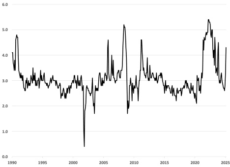 The latter effect is what we have been witnessing lately. The recent rise in gold prices has materialised due to changes in the denominator (the dollar), as non-US central banks and sovereign wealth funds buying gold to diversify away from the dollar and other financial players buying gold to hedge against devaluation risks as inflation expectations soar. Over a decade of close to zero interest rates and relentless money printing in the form of QE have created a fertile ground for price inflation. In our view, the 2022-23 period was just the beginning of a prolonged inflation period and US households seem to agree. The University of Michigan 12-month inflation expectations shot back up to 4.3% (see exhibit 4). More shockingly, the 5-year Inflation Expectations Index rose to the highest levels since 1991. Exhibit 4: US Inflation Expectations are on the rise again %