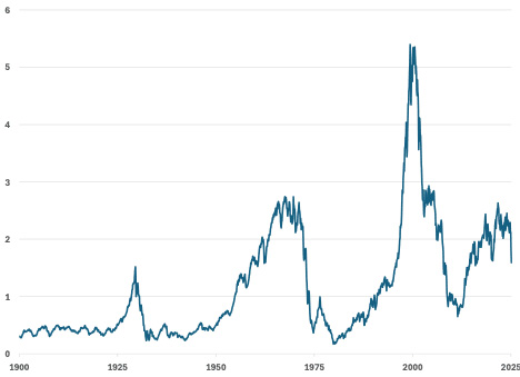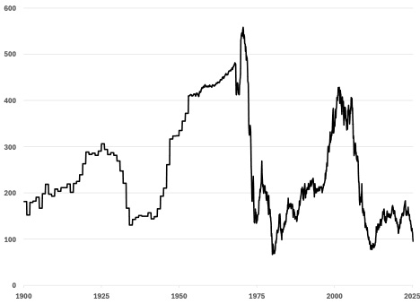 Source: Schiller Data, Goldmoney Research While the US equity market priced in gold is nowhere near the levels of the dot.com bubble, the equity-to-gold-ratio is still elevated compared to historical levels, and, thus, also elevated compared to stocks and oil prices. Hence, from a pure equity-to-gold-price-ratio, stocks have more downside form here, at least in real terms. Nevertheless, equities priced in gold don’t look nearly as extremely overvalued as when priced in dollars, where – despite the recent sell off - common stock valuations measures such as P/Es or market cap-to-GDP continue to signal extreme valuations. Hence, we believe that all the money creation over the past 15 years (or arguably longer) has initially impacted stocks and equities first without causing too much broad based inflation in goods and services. Subsequently, we saw a brief period of inflation from 2022-2023 where prices for goods and services rose sharply, but equities and property prices continued to rise. But that was also the starting point of the gold rally, and unlike normal goods and services, gold has continued to rise as it prices in future devaluation of the dollar. In our view, this is just the beginning, and we expect gold to outperform everything else in the medium term.