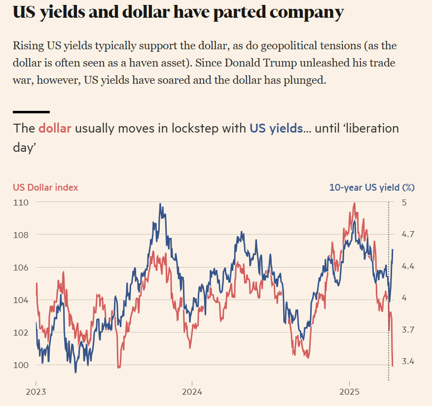 WTF? So, Miran thinks that overconsumption and deficit-spending is so indispensable to the global economic system, that other countries should pay the US to continue its shameless freeloading? Indeed, that is his position. And the belief is not limited to Miran either. In fact, this is the ideological cornerstone upon which Trump’s trade philosophy rests. ‘We will spend; you will pay. We will take; you will give. We will rule, you will follow.” Get the picture? Oh—and just to add insult to injury—we also regard ourselves as the ‘victim’ in this relationship. (“They’re ripping us off.”) It boggles the mind. Trump’s whole scattershot approach to international trade speaks to this unbounded arrogance. And that appears to be the driving force behind “Liberation Day”, the immutable belief that the rest of the world exists only to serve US interests. Am I wrong? I am not wrong. Just look at the markets. Investors are voting with their feet. They’re headed for the exits. Their panic is a referendum on Trump’s trade policies. This is not a “financial crisis”. This is a “tariff-induced run on US risk assets” that is attributable to one man alone: Donald Trump. No one else caused this. Trump’s signature economic program (reciprocal tariffs) is based on the wrongheaded view that the rest of the world is supposed to function as America’s personal ATM. But investors don’t ascribe to this belief; they think the tariffs are going to trigger a firesale of US financial assets and crash the market. And that’s what the plummeting Treasuries market is telling us, too. This is from an article at Politico: