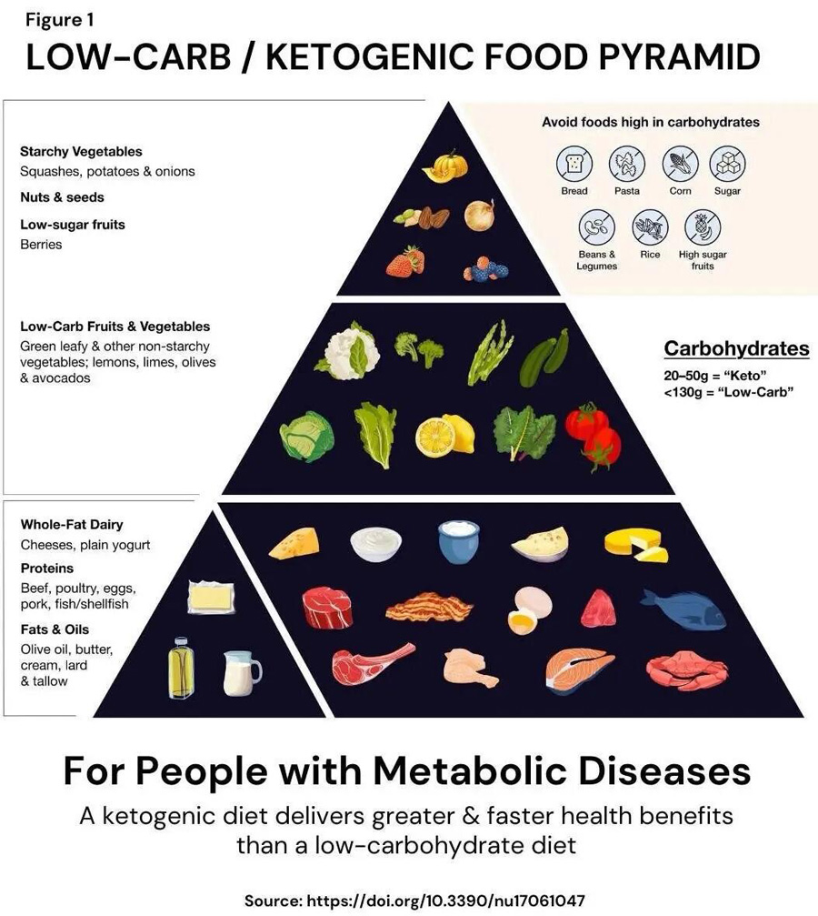 With chronic illnesses soaring across the United States, a group of doctors and nutrition researchers say it’s time to reconsider the foundation of American dietary advice—starting from the bottom up. In a peer-reviewed paper published in Nutrients, the authors contend that the traditional carb-heavy diet has not only failed to safeguard public health but may be contributing to rising rates of obesity and Type 2 diabetes. They propose a new low-carbohydrate food pyramid designed for the vast majority of American adults showing signs of metabolic dysfunction. Their model—built on protein, full-fat dairy, and healthy fats—challenges decades of federal guidance and reignites a long-simmering debate about dietary fat’s role in chronic disease. Rethinking the Pyramid The original food pyramid, introduced by the U.S. Department of Agriculture in 1992, stacked grains at the base, fruits and vegetables in the middle, and fats and oils at the top. Though replaced in 2011 by MyPlate—a graphic that uses a dinner plate divided into five food groups (fruits, vegetables, grains, protein foods, and dairy)—the original pyramid’s grain-centric emphasis still lingers in public messaging and perception. The paper calls that framework outdated and potentially harmful. Its 24 authors, including physicians, dietitians, and metabolic researchers, say the traditional model overlooks growing evidence linking high carbohydrate intake to obesity, diabetes, and other chronic illnesses. In its place, they introduce a striking alternative: the first low-carbohydrate food pyramid. At its base are foods once discouraged—meat, eggs, full-fat dairy, and healthy oils. Non-starchy vegetables and low-sugar fruits occupy the middle tier. At the top are starchy vegetables, higher-sugar fruits, and nuts, recommended only in limited amounts. Foods high in carbohydrates—such as grains, rice, beans, and added sugars—are excluded entirely. The authors describe the model as both low-carbohydrate and ketogenic—terms they use interchangeably in the paper. A ketogenic diet typically restricts carbohydrate intake to between 20 and 50 grams per day, shifting the body into a fat-burning state called ketosis.