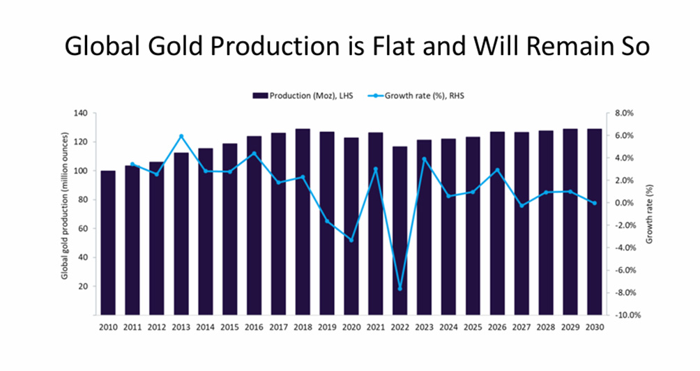 Continually increasing demand with flat output is a recipe for higher gold prices.