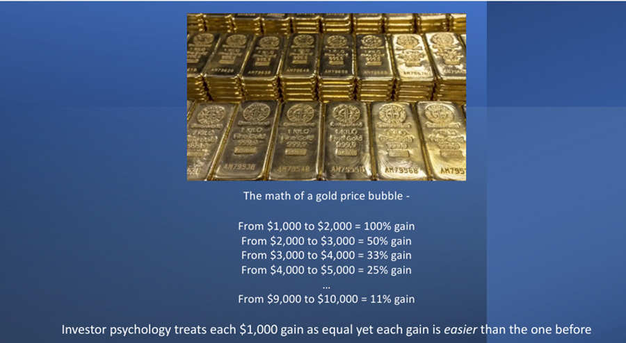 What investors don’t realize at least initially is that each $1,000 per ounce gain is easier than the one before. This phenomena involves the interaction of simple math and more complicated behavioral psychology.