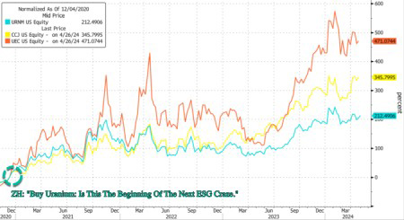 Nuclear power is the largest single source of carbon-free electricity. Given onshoring trends, electrification of transportation and buildings, and, of course, as we've noted in "The Next AI Trade," the proliferation of AI data centers will overload power grids nationwide unless a significant upgrade is seen. We again highlighted the enormous investment opportunity early Monday titled "Everyone Is Piling Into The "Next AI Trade"", which lists companies powering up America for the digital age. Nearly 3.5 years ago, we provided readers with a straightforward investment thesis: "Buy Uranium: Is This The Beginning Of The Next ESG Craze." Back then, it became apparent to us that the resurrection of the nuclear power industry was imminent. And the trend is only gaining steam as the revival of nuclear power plants will continue benefiting some of the largest uranium producers, such as Cameco. We told readers to buy uranium stocks, such as Cameco around the $10 handle - now it's nearing $50 a share. As a whole, uranium stocks have soared...