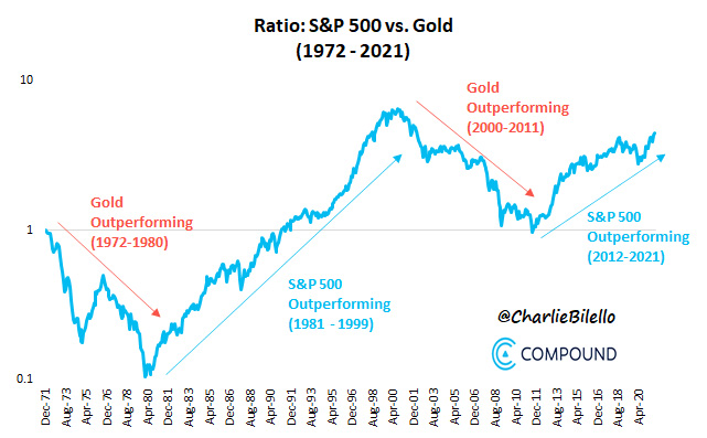 Source: Charlie Bilello An even better example is from 1972 to 1980 when gold returned 1,256% to the S&P 500’s 97%. Of course, stocks take their turn in the spotlight too. From 2012 to 2021, stocks returned 336% vs gold’s 16%. And from 1980 to 1999, stocks were absolutely dominant as gold went dormant for nearly two decades. Over the past few years, both have done well. The point here is that it’s a cycle. Just take a look at the chart below. It shows the ratio of S&P 500 performance vs gold through 2021.