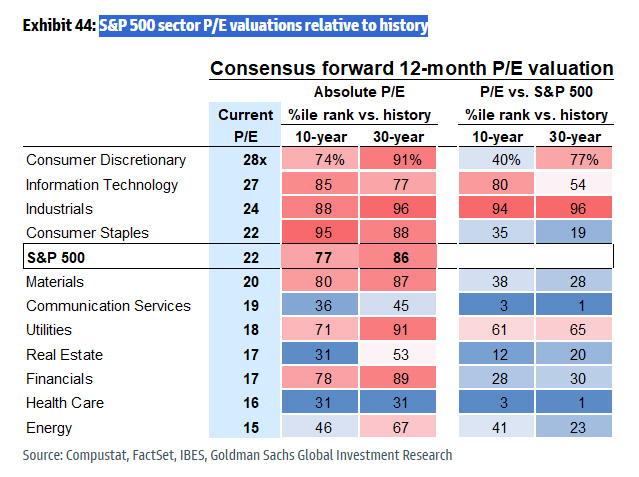 Source: Charlie Bilello I believe we switched back to precious metals mode at the beginning of last year. And if this is the beginning of a fresh cycle, we may be in for another 7-plus years of precious metals outperforming stocks. Given the magnitude of what we face, it could go on longer than that. Global debt has never been anywhere near this high before. Catalysts and CausesPeriods where gold outperforms tend to be chaotic. Past catalysts have included a crash at the end of a major bull market (1971 and 2000), and an inflationary shift in monetary policy (1971 and 2000). Wars often play a part as well, as they did in the 1970s (Vietnam and others), and the early 2000s (War on Terror). Wars spike deficits and increase the monetary supply. They also drive safe-haven demand from both central banks and investors. I believe our situation today fits the bill. Stocks have rebounded since their recent fall, for now, but markets look expensive. The chart below, from Goldman Sachs, shows that almost all U.S. stock sectors are in their top quartile (25%) of historical valuations.