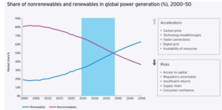 Source: EY EY has predicted that solar and wind are on track to become the global baseload electricity source. According to the experts, the two traditional renewables are expected to represent 38% of the global energy mix in 2030, with the figure hitting 62% of the energy mix by 2050. China, Europe and the United States will drive a 53% increase in solar and wind generation, producing over 57% of global solar and wind output by 2050, EY has forecast. It’s going to be interesting to see how these predictions unfold considering that oil and gas currently supply nearly 70% of the United States’ primary energy with renewable energy including solar, wind, biomass, biofuels, wood and hydroelectric supplying just 13%. By Alex Kimani for Oilprice.com