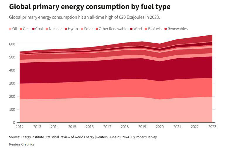 At a time when the peak of "green" virtue signaling has come and gone, we regret to inform you that all that jawboning and posturing has achieved... absolutely nothing because according to the Statistical Review of World Energy report released on Thursday, global fossil fuel consumption and energy emissions hit all-time highs in 2023 (even as fossil fuels' share of the global energy mix decreased slightly on the year).