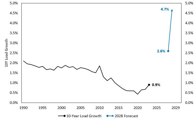 Prime Minister Justin Trudeau has made a hard pivot, embracing nuclear power to achieve Canada's net-zero emissions goals. This marks a major reversal after years of promising to move the economy away from commodity extraction. Let's revisit our December 2020 note titled "Buy Uranium: Is This The Beginning Of The Next ESG Craze" and, more recently, "The Next AI Trade." In these notes, we argue that nuclear power is the cleanest and most reliable energy source for electrifying America. Thank AI data centers for the consumption surge in power. Goldman's forecast of cumulative electricity growth shows that over the next five years, electricity growth is expected to jump from 2.6% to 4.7%, driven by major utilities revising their estimates higher.