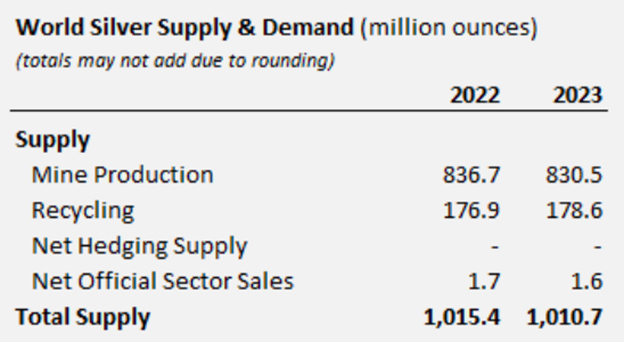 If you’re unclear of the math, each COMEX silver contract is alleged to represent 5,000 ounces of silver. As such, the total volume last Friday of 169,885 contracts equates to 849,425,000 ounces trading hands. As you can see below, The Silver Institute estimated total global mine supply for 2022 and 2023 to be around 830,000,000 ounces.