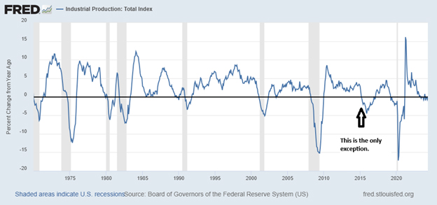 The yellow line on the graph above appears to represent a more accurate way to portray the full inflationary story, not just the parts that the Fed likes to report. We’ve actually written about “real” inflation before. Next, let’s take a look at a few more data points… Economic Slowdown Since 2021?Since 1970, every recession was preceded by a slowdown in year-over-year industrial production. There was only one exception to this rule shortly after Trump was elected to his first term, where the slowdown happened but a recession did not follow (source):