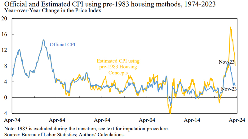 But keep in mind, there’s also a big difference between GDP and prosperity. Namely that GDP is a measure of spending, while prosperity factors in how that spending is happening in the economy (Are people prosperous?). Here’s a big hint: Consumers are racking up credit cards with inflated interest rates at record levels to prop up the current GDP by also paying inflated prices. So the GDP is obviously unhealthy. But it also isn’t the only bit of data that doesn’t add up… Thanks to a study conducted by the National Bureau of Economic Research (NBER), we can feel pretty certain that inflation hasn’t been accurately reported by officials since the pandemic started, either. One graph from that study illustrates this point perfectly. It revealed that the price inflation rate was actually closer to 17% at its peak, once you include housing costs like mortgage payments. It was still close to 7% as late as November 2023, take a look (yellow line):