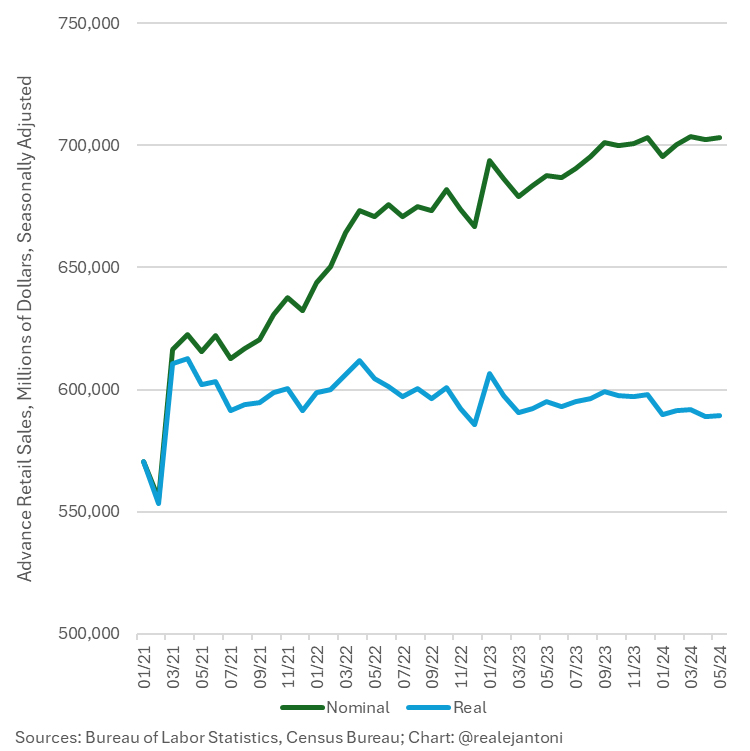 As you can see on the graph above, since 2021 year-over-year U.S. industrial production has been experiencing a rapid slowdown. Retail sales aren’t what they’re cracked up to be, either. On the graph below, provided by E.J. Antoni on “X,” you can see two lines. The green line represents retail sales. The blue line represents retail sales after they’re adjusted for inflation (source):