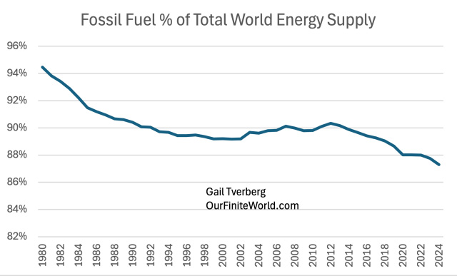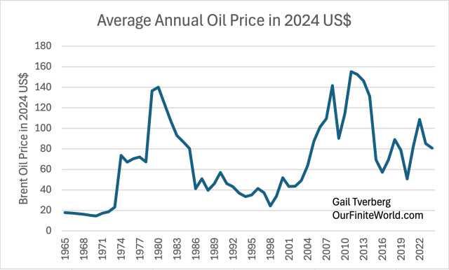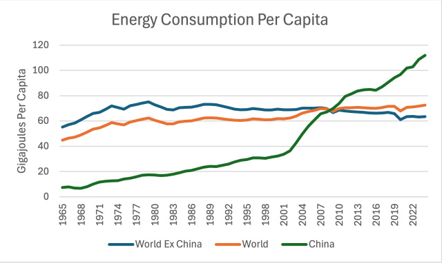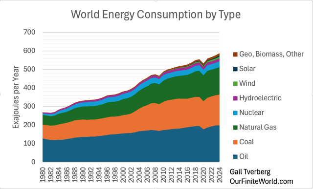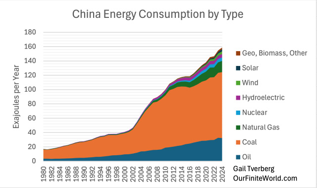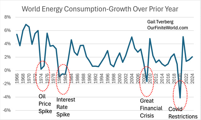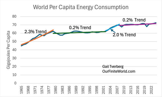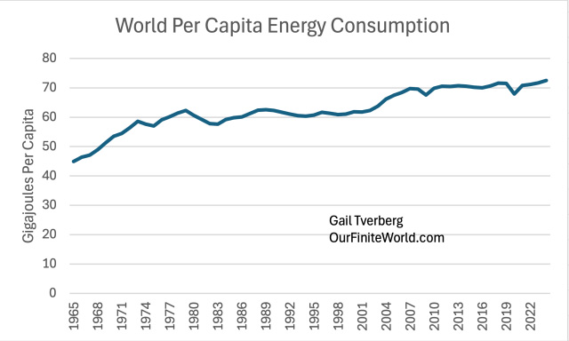 There is also the issue of financing any shift to nuclear electricity. Upfront costs are huge, but nuclear power plants (with proper fossil-fuel-based maintenance) can operate for 60 to 80 years. As limits on fossil fuels are reached, building all these plants, using large amounts of fossil fuels, seems likely to reduce fossil fuels energy available for other uses. This makes financing a major challenge. [7] The recent annual rising trend of 0.2% in per capita consumption of energy looks vulnerable to disruption by any economic problem that arises.Figure 6. World energy consumption by type of energy based on data of the 2025 Statistical Review of World Energy, published by the Energy Institute. A major reason why energy consumption keeps rising is because, as population rises, there is a need for more food, housing, and transportation for this larger population. The consumption of energy products allows people to meet these needs. In fact, every aspect of GDP depends upon energy consumption. Figure 7. World per capita energy consumption based on data of the 2025 Statistical Review of World Energy, published by the Energy Institute. Figure 7 indicates that world energy supply per capita rose between 1965 and 1979. It remained relatively flat between 1979 and 2002 and then rose quite rapidly until 2008. Since then, its growth rate has again been essentially flat. Fitted trend lines show what these growth trends have been: Figure 8. Similar to Figure 7, with exponential trend lines fitted for time periods noted in text. I have written recently about the huge US government debt increase since 2008 that has tended to prop up both the US and world economies. With all this “support” since 2008, the fact that world per capita energy consumption growth has only risen by 0.2% per year is frightening. With the high level of debt, there is a danger that there will be another major recession that could bring huge financial difficulties. At some point, higher debt levels become unsupportable. Thus, what is really an energy crisis can “morph” into a financial crisis. Figure 9, One-year increase in total world energy consumption based on data of the 2025 Statistical Review of World Energy, published by the Energy Institute. The types of events that have brought energy consumption down in the past are quite varied, as shown on Figure 9. Note that the lows keep getting lower. There is a danger that another recession-type event could come along and push the world economy toward a long-term downtrend in energy supply per capita. [8] China plays a huge role in the world’s energy consumption. As resource limits are hit, China has the potential to pull the world economy down with it.China energy consumption (Figure 10) follows a very different pattern from world energy consumption (Figure 6). Figure 10. China’s energy consumption by fuel based on data of the 2025 Statistical Review of World Energy, published by the Energy Institute. There are several important things to notice about China’s energy pattern: (a) China’s energy consumption is heavily dominated by coal. (b) There was a sharp expansion in China’s energy consumption, starting about 2002. This is related to China joining the World Trade Organization (WTO) in December 2001. On Figure 8, we noted 2.0% annual world per capita energy consumption growth between 2002 and 2008, which was far greater than in either the period before 2002 (at 0.2%), or the period after 2008 (at 0.2%). This shifting pattern was largely driven by China’s spurt in energy consumption after joining the WTO. (c) China’s energy consumption has been growing more rapidly than that of the rest of the world. This is closely related to China’s becoming the leading manufacturer for the world economy, at the same time most of the wealthier countries have been moving manufacturing to lower-cost areas (ostensibly to reduce CO2 emissions). (d) China’s energy consumption now plays an outsize role in the future of the world economy. In 2024, China consumed 27% of the world’s energy supply. This is more energy than that consumed by the US (16%) and the EU (9%) combined. (e) With this energy dominance, any stumble in the world’s supply of fossil fuels and other mineral resources will affect China. One area where China is running into limits is with respect to oil supply. China imports most of its oil. Comparing 2024 to 2023, China’s total oil consumption decreased by 1.4%. Its diesel consumption decreased even more, by 2.8%. As the leading manufacturer of the world, China has been consuming huge amounts of minerals such as copper. This Copper Council report seems to indicate that China uses about 56% of the world’s copper supply. If there is a shortage of copper, China will be affected. We can look at energy consumption growth on a per capita basis. Not surprisingly, China’s rapid growth has pulled down per capita energy consumption growth elsewhere. Figure 11. Energy consumption per capita, separately for the World, China, and the World excluding China, based on data of the 2025 Statistical Review of World Energy, published by the Energy Institute. The pattern shown in Figure 11 is disturbing. Outside of China, energy consumption per capita has been falling for a long time. The rest of the world, to a significant extent, has lost its ability to manufacture the goods needed for its own people. China’s energy consumption per capita is now reported to be on a par with Europe’s, but China, too, faces issues as it encounters resource limits of many kinds. No wonder there is conflict among nations! Every country would like limited resources. If one country has more, other countries will get less. [9] Inflation-adjusted oil prices have bounced around, rather than following a consistent upward pattern. This limits their long-term impact on production.Figure 12. Average annual inflation-adjusted oil prices based on data of the 2025 Statistical Review of World Energ