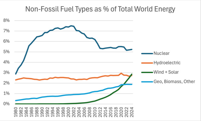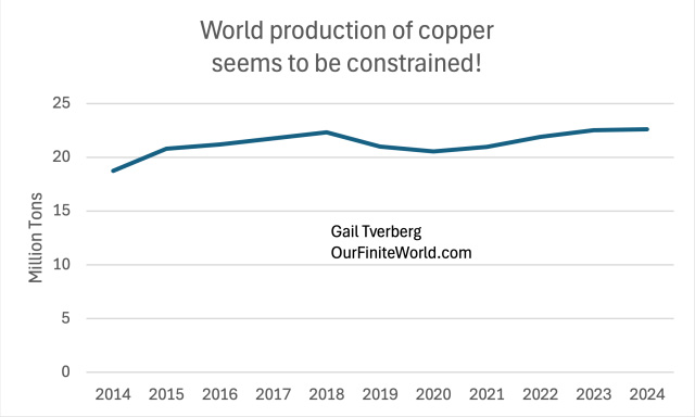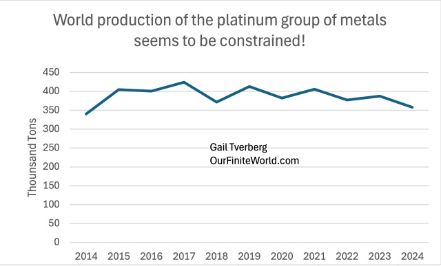 Figure 1. Chart showing the level of per-capita diesel consumption, relative to the per-capita consumption in 1980. Amounts are based on Diesel/Gasoil amounts shown in the “Oil-Regional Consumption” tab of the 2025 Statistical Review of World Energy, published by the Energy Institute. Figure 1 suggests that the supply of diesel started being constrained during the 2008-2009 recession. The decrease became more pronounced starting in 2014, which was when oil prices fell (Figure 12). In fact, this downward trend since 2014 continued into 2024. The constraint in diesel production/consumption comes through oil prices that fall too low for the producers of diesel. If prices rise, they don’t stay high for very long. If there isn’t enough diesel, cutbacks in some applications will be needed. One new workaround for the inadequate supply of diesel seems to be a reduction of international trade through tariffs. If goods can be produced closer to where they are purchased, then perhaps the economic system can accommodate the declining availability of the diesel supply a little longer. It should be noted that jet fuel consumption is also constrained. The type of oil used is quite similar to diesel. Transferring the transportation of goods from trucks and ships to jet aircraft is not a solution! [2] Copper supply seems to be constrained.There has been much discussion of transitioning to the use of more electricity and less fossil fuels. This would require both a greater build out of electricity transmission systems and more use of electric cars. Each of these uses would require more use of copper. Electric cars are reported to each require 40kg to 80kg of copper, while cars with internal combustion engines use only 20kg of copper. Building charging stations for all these cars would further add to copper needs, as would adding new transmission lines to carry the higher total electricity supply. Figure 2. World copper production, based on data of the 2025 Statistical Review of World Energy, published by the Energy Institute. Figure 2 shows that even with the expected increase in demand for copper resulting from a shift toward electrification, total world extraction of copper has remained relatively flat. A major issue is that it takes a very long time to build a new copper mine. Worldwide, the average time to new production is 17.9 years. For this reason, a temporary increase in price cannot be expected to drive up production very quickly. If diesel is used in extracting copper, and diesel’s consumption is constrained, the restricted diesel supply can also be an issue in expanding the copper supply. The new tariffs on copper, announced by President Donald Trump, seem to be intended to drive industries that use copper to look for substitute minerals. With a very long lag, the tariffs might also lead to an increase in copper production. Tariffs have more staying power than volatile price changes. There doesn’t seem to be a quick solution, however. [3] Platinum extraction also seems to be constrained.Figure 3. World production of platinum and palladium (which is closely related) based on data of the 2025 Statistical Review of World Energy, published by the Energy Institute. Platinum currently has a wide variety of applications, including use in catalytic converters, jewelry, medicine, and industry. Some people are also hopeful that platinum will enable the wide use of hydrogen fuel cells to help meet the world’s demand for electrical power in a way that doesn’t require burning fossil fuels. In fuel cells, platinum acts as a catalyst, enabling the separation of hydrogen and oxygen molecules in water through a chemical process, rather than combustion. One issue mentioned in the lack of growth in platinum production is persistently low prices. New mines will not be opened unless it is clear that production will be profitable. Another source indicates that the largest producing country, South Africa, has been having problems with electrical supply and rail transportation. These problems, in turn, seem to be related to South Africa’s dwindling coal supply. Its peak coal production took place in 2014. We should not be surprised if South Africa continues to have problems producing platinum in the future. [4] Up until this report, the Statistical Review of World Energy has used an optimistic approach to quantifying the benefits of intermittent renewable electricity.The traditional method of evaluating energy products involves analyzing the amount of heat produced in combustion. In past years, the Statistical Review of World Energy used a method that essentially assumed that the intermittent electricity produced by renewable sources (including hydropower) completely substitutes for the equivalent dispatchable electricity generated by fossil fuels. I think of this as the “wishful thinking” methodology. The current methodology gives renewables less credit, recognizing the fact that intermittent sources substitute primarily for the fuel that electricity generating plants would use. It is becoming increasingly clear that intermittent power doesn’t work very well on a stand-alone basis. Many types of workarounds, including batteries and backup fossil-fuel generation, are required to supplement it. The new methodology gives about 22% more credit to nuclear power than the old method. Nuclear power can be counted on 24 hours per day. Also, like fossil fuel generation, it provides the necessary inertia (the energy stored in large rotating components such as generators, which allows the power system to maintain a steady frequency) to keep electricity moving through transmission lines. Without sufficient inertia, electrical outages similar to that recently experienced in Spain, are likely. The revised methodology seems to align better with the methods used by the US Energy Information Administration and the International Energy Agency. In the past, it has been confusing with major agencies using differe