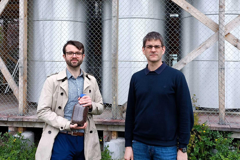 Researchers Samuel Heiniger (left, holding a jar of iron ore) and Professor Wendelin Stark (right) in front of the three iron reactors containing hydrogen