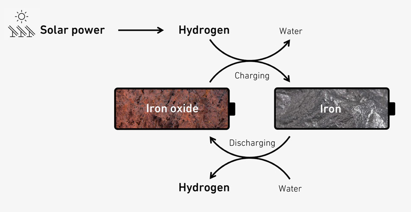 Surplus solar power is used to split water to produce hydrogen in the summer; it's then streamed into stainless steel reactors filled with iron ore at 752 °F (400 °C). The hydrogen extracts oxygen from the iron oxide, so you're left with iron and water in the reactor, ready to store without expending a lot of energy.