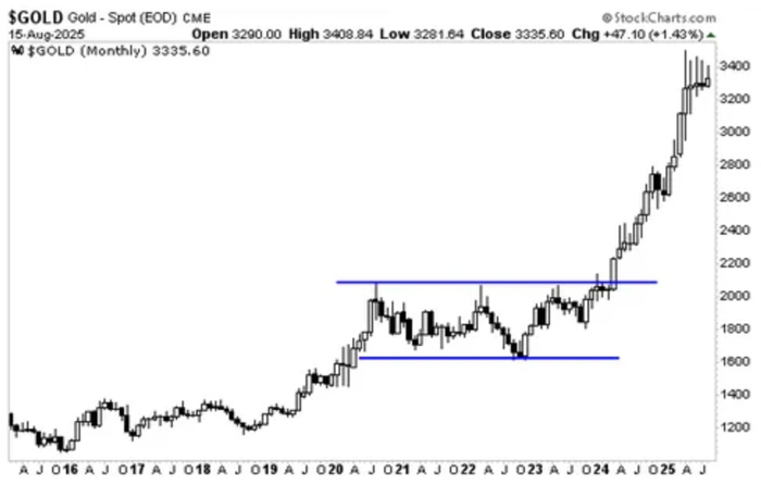 “So, what,” many investors would respond. “a rally from $2,300 to $3,200 means gold has gained just ~40% during the course of a year and a half many tech plays can rally that much in a matter of months!”