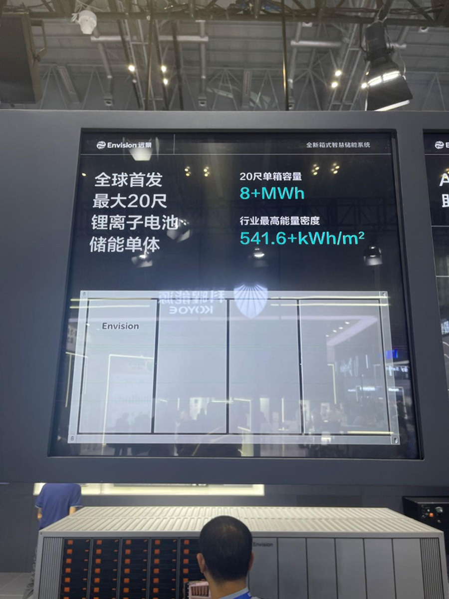 It's colossal. Not just in size, but in the 8-MWh figure. The company says its newest product uses 700-Ah lithium iron phosphate (LiFePO4) cells in a liquid-cooled 1,500 to 2,000-volt configuration that's good for nearly 16,000 charge cycles that all fits in half a normal shipping container. All in, the system weighs about 55 tons (50 tonnes) To put it into simple terms, at 1,500 volts DC, it could theoretically power an average US home at 1 kW continuously for about 640 hours – a few hours shy of 27 days. Not that this energy storage system is designed for such a thing. It's designed with a short-term charge and discharge duration configurable between two and eight hours. Short duration plays a crucial role in balancing renewable energy sources by maintaining a stable supply of power, storing excess electricity when production is high and discharging power when production wanes. The downside to having two-hour short cycles means that at 16,000 life cycles, the battery would only last a little over three and a half years. The battery cells are produced by AESC, a Japanese company known for supplying high-performance batteries to numerous electric vehicle manufacturers. The system's inverters and battery management system (BMS) are all made in-house by Envision. ![]() Information from the EESA show about Envision Energy's 8-MWh container battery