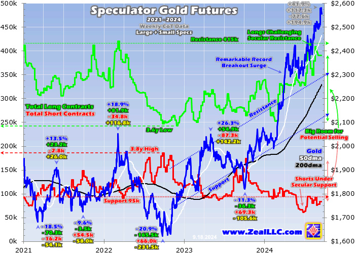 Spec longs really outnumber shorts, averaging 3.4x higher over the past 52 CoT weeks.  That makes longs proportionally more important than shorts for near-term gold-price direction.  Those were way up at 390.9k in that latest-reported CoT eight days before the FOMC meeting.  And odds are they surged much higher by FOMC eve, probably exceeding their 415k resistance when that 50bp cut and super-dovish dots hit!