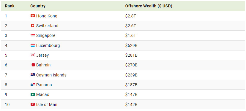 Hong Kong tops the list with over $2.8 trillion in offshore wealth. The territory boasts a robust banking infrastructure and a business-friendly environment. Additionally, its Offshore Profit Tax Claim allows offshore owners to pay 0% tax on offshore income.
