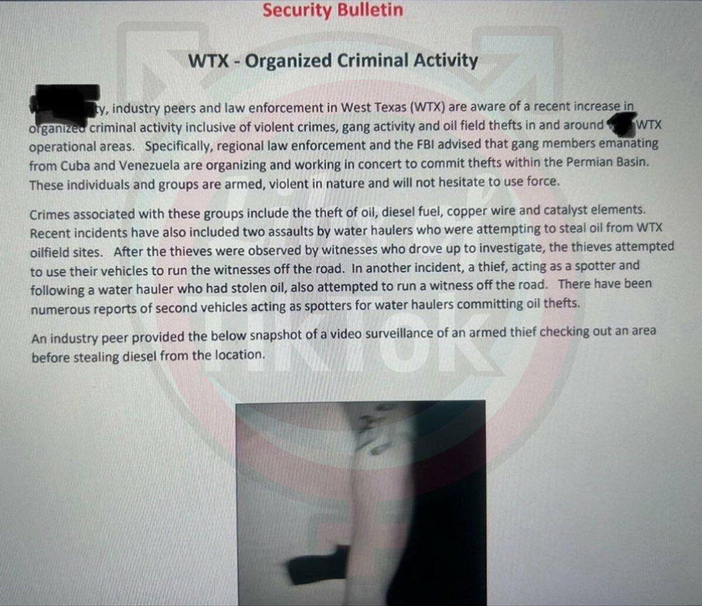 According to Libs of TikTok, a Texas-based oil/gas company issued a memo to employees informing them that police and the FBI have warned armed Cuba and Venezuela migrant gangs are committing thefts in the Permian Basin (America's highest producing oil field).