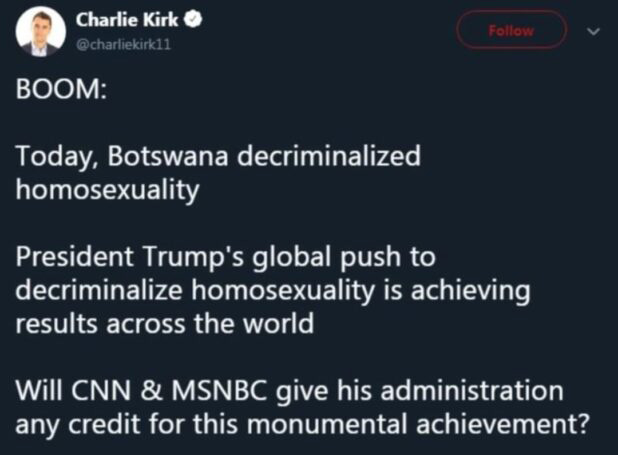Charlie Kirk had been a cog in the propaganda machine of the Republican Party, declaring totally baselessly that a vote for Trump in the 2024 election was a vote to “bring peace to the Middle East.” And when the exact opposite happened, Charlie was imploring his followers to simply “pray” and uncritically trust the President. He was detestable. And he wasn’t just some random commentator or podcaster. He was a full-time, extremely influential Republican Party apparatchik. His mega-donor funded outfit “Turning Point USA” ran “Get Out The Vote” operations for the Trump Campaign in the 2024 election. I’m not saying Charlie Kirk wasn’t entitled to engage in these political activities in a free society with lots of billionaire largesse available for ambitious operatives willing to serve as Republican Party Youth Galvanizer. I’m just saying I’m not obliged to fawningly express reverence for him now, simply by virtue of his sudden and hideous death. Furthermore, I am very much entitled to challenge the hagiography and mythology that is so quickly congealing around him, such that he’s now being expeditiously put into the pantheon of martyred American saints — which is completely ridiculous. However, I’m fully aware that my limited efforts in this regard will have virtually zero effect. The absurd reverence-fest will continue unimpeded. Even more hostile was the reaction of right-wing Internet provocateur Andrew Anglin, who maintained his angry, contrarian reputation by quickly publishing a series of posts ferociously denouncing the slain conservative activist. The lengthiest of these drew more than 500 comments on our website, with Anglin’s deeply emotional reaction probably explaining the obviously missing word in his title. Sharply attacking Kirk from the right, Anglin eagerly dredged up quotes that demonstrated the victim’s notably liberal views on various hot-button issues. This hardly surprised me since it merely reflected the leftward shift of our conservative movement, whose right-wing MAGA partisans these days espouse many positions on social issues that would have marked them as extreme progressives as recently as the 1990s. For example, Anglin noted that one of Kirk’s Tweets praised Trump’s strong support for global gay rights and condemned the media for failing to give the president sufficient credit on that score: